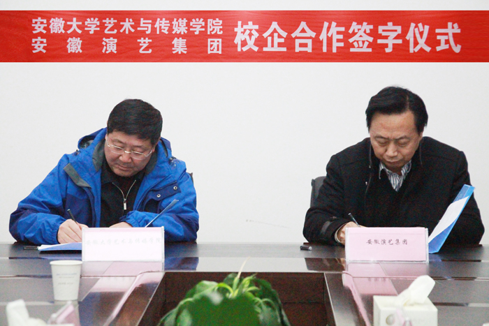 为深入探讨校企共育人才的培养模式,进一步提升艺术专业建设服务社会能力,实现艺术专业人才培养与文化市场需求无缝对接,2014年12月9日,安徽大学艺术与传媒学院与安徽演艺集团签署校企合作协议。学院党委书记、院长周之虎,副院长胡献平,教务与学生工作部副部长周爱宝(主持工作)、刘长华,综合办公室副主任曹晓富等相关负责同志参加签约仪式。