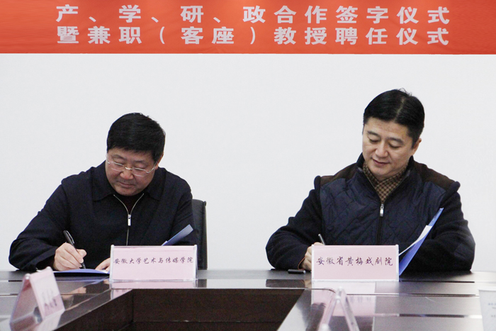 12月17日下午,安徽大学艺术与传媒学院与安徽省黄梅戏剧院产学研合作签约仪式在学院第一会议室举行。安徽省黄梅戏剧院院长、国家一级演员、戏剧梅花奖获得者蒋建国,安徽大学艺术与传媒学院党委书记、院长周之虎,副院长胡献平,学院综合办公室、教务与学生工作部负责人等出席签字仪式。