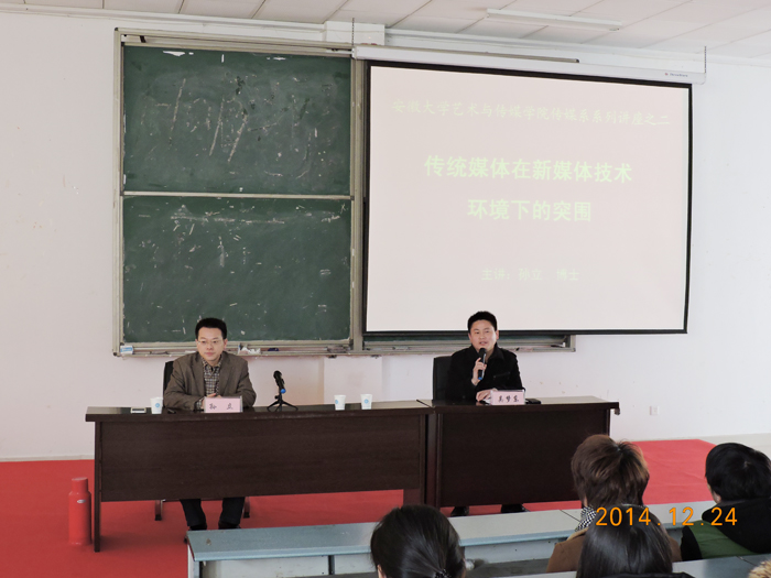 12月24日,中国科学技术大学博士、时代新媒体出版社副社长孙立应邀来到传媒系作题为“传统媒体在新媒体技术环境下的突围”的学术讲座,系负责人韩大国教授热情接待了孙立一行。讲座由传媒系主任助理吴梦东老师主持,全系近200名师生共同聆听了报告。