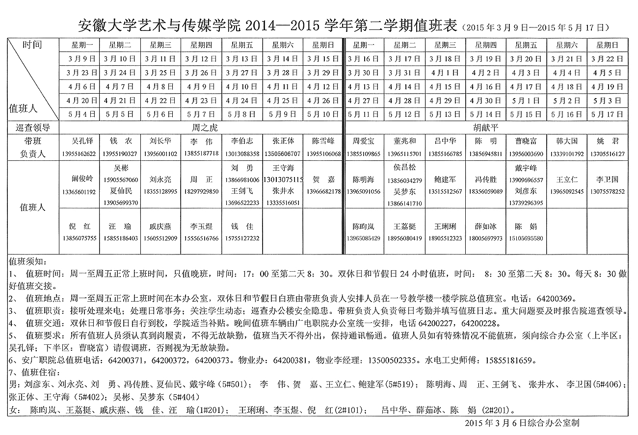 安徽大学艺术与传媒学院2014—2015学年第二学期值班表