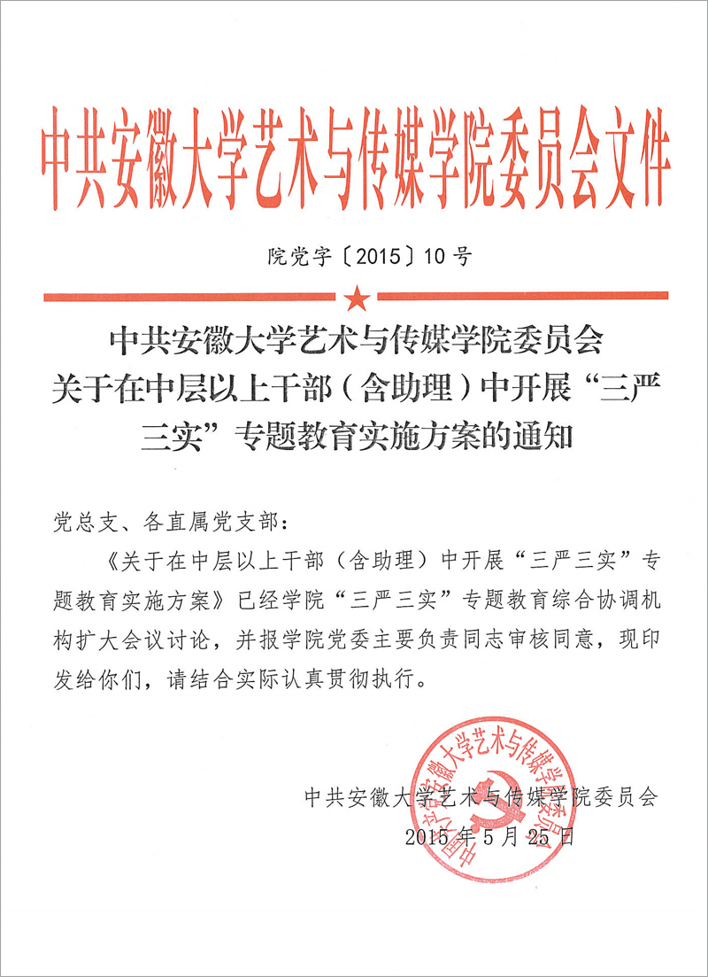 中共安徽大学艺术与传媒学院委员会关于在中层以上干部(含助理)中开展“三严三实”专题教育实施方案的通知