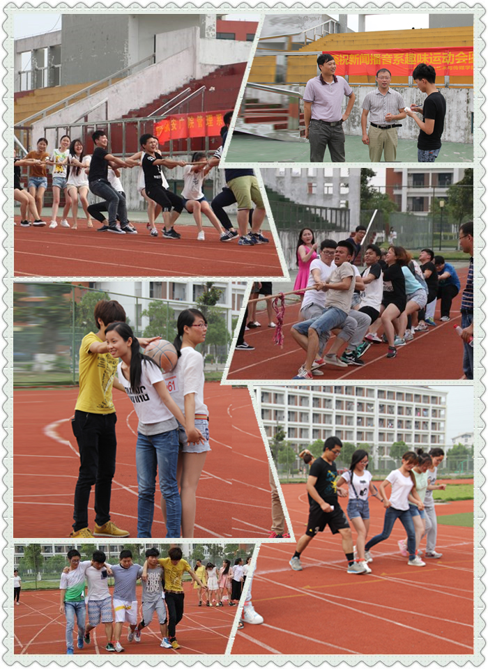 新闻播音系组织开展的首届趣味运动会,是由系学生会组织发动的,学生会邀请系主任吴孔铎教授担任顾问,学生处张井水老师、系学管秘书刘涛老师担任裁判长。这次趣味运动会主要有拔河、五人六足、背部运球、杯水相连等四个项目,全系共208名同学参赛。