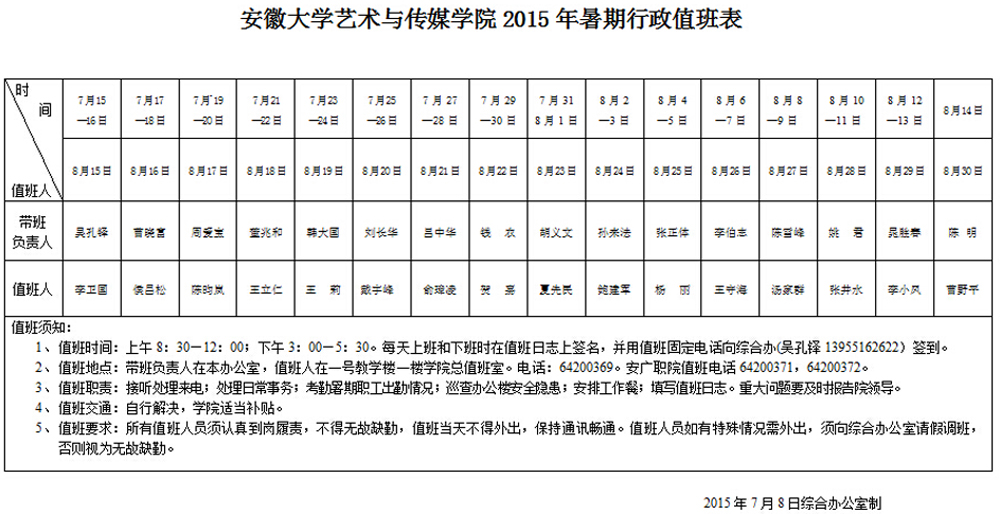 2015年暑期行政值班表