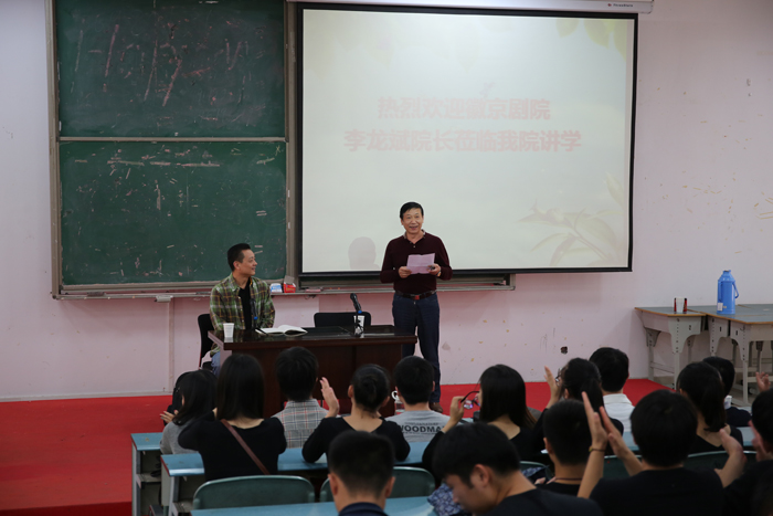 聘任仪式后,李龙斌教授给戏剧影视系全系师生做了一场名为《徽剧传承》精彩讲座。讲座由张晶副院长主持。张晶副院长首先给师生们介绍了李龙斌教授的演艺经历和所得荣誉,号召师生认真聆听李教授的讲课,将会受益终生。此次讲座同时也作为学院省级“卓越人才培养计划”之“名人名家进校园”活动之一,为师生们提供近距离接触名家名师的机会。
