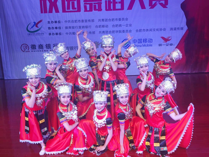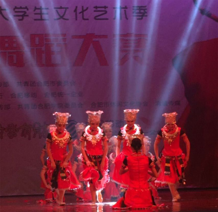 11月14日下午,我院13位同学在合肥学院致用礼堂参加了由中共合肥市委宣传部、共青团合肥市委员会主办,中共蜀山区委宣传部、共青团、合肥学院委员会承办的2015“青春季梦飞扬”合肥大学生文化艺术季校园舞蹈大赛的决赛。最终我院学生排练创作的苗族舞蹈《一抹红》荣获了总成绩第二名的好成绩。
