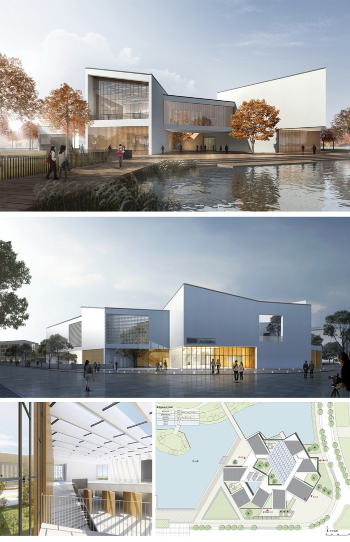 美术馆设计延续校园总体规划的理念,体现发扬徽派艺术和空间特色。将建筑体量打散分化为若干个展厅,并将各展厅通过搭接、串联、偏转的重构方式形成新的整体。错落有致的黑色单坡屋顶,干净利落的白色墙面和温暖朦胧的木质格栅,室内与室外空间的交融,共同营造出独特的新徽派“艺术聚落”,实现建筑与自然的共存。