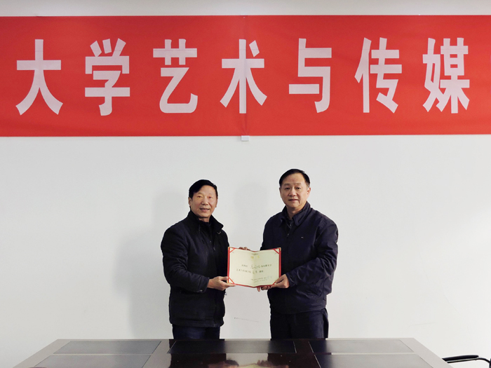 讲座开始前,学院在三楼会议室举行授聘仪式,张晶副院长代表学院向禹成明副总编颁发了安徽大学艺术与传媒学院客座教授聘书。