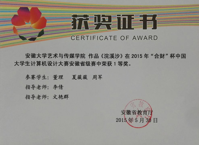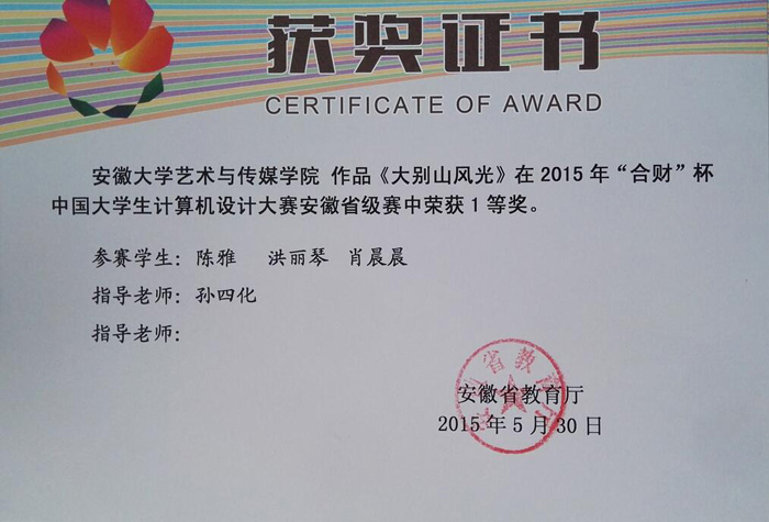 根据省教育厅皖教秘高﹝2015〕128号文件通知,我院学生在2015年中国大学生计算机设计大赛安徽省赛区获得佳绩,共获2个一等奖、5个二等奖、1个三等奖、7个优胜奖等17个奖项。获奖名单如下: