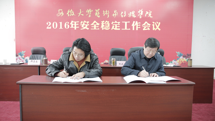 会上,学院党委书记、院长周之虎代表学院与各系部、各部门负责同志签署了《2016年安徽大学艺术与传媒学院安全稳定工作责任书》和《2016年安徽大学艺术与传媒学院党风廉政建设目标责任书》。