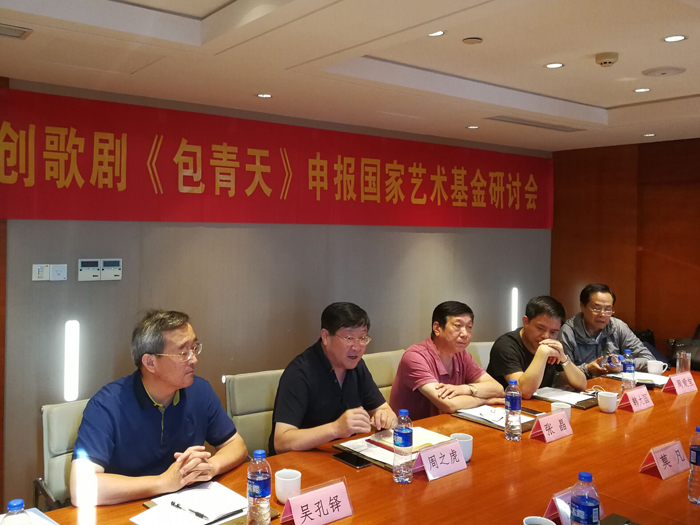 孙来法就歌剧《包青天》的缘起、进展情况及国家艺术基金的申报要求向与会专家做了汇报与解读,并对作曲家莫凡先生加入表示感谢,希望在莫凡先生的支持下,歌剧《包青天》早日呈现给世人。莫凡先生就国家艺术基金的严肃性、严谨性和歌剧的创作思路、创作素材进行细致的阐述。他认为,此时召开研讨会非常及时,也非常必要,只有整合优势力量,才有可能立项,也有助于歌剧《包青天》的推进。导演周爱宝进行了细致的导演阐述。指挥家徐宏简要介绍了安徽乐团的情况,表示安徽乐团将为剧目的顺利推出全力以赴。与会专家还就声乐、舞美、灯光、服装、项目申报团队组合、项目申报书的填报、经费的预算和人员分工等方面展开深入讨论。