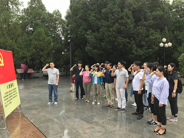 大家来到金寨县革命烈士陵园,怀着无比崇敬的心情,登上一级级象征革命先烈英雄事迹的石阶,来到巍峨耸立的金寨革命烈士纪念塔前,举行了庄严的重温入党誓词宣誓仪式。