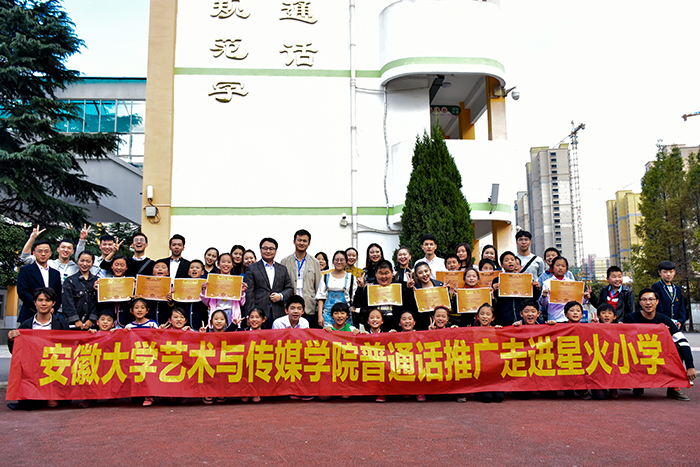 10月25日下午,安徽大学艺术与传媒学院20余名师生,在学院语言文字委员会有关同志的带领下,来到合肥市星火小学,和小学生们共同开展了“推广普通话,走进小学校园”活动。星火小学副校长邓绍建、教导主任阮大鹏出席活动。