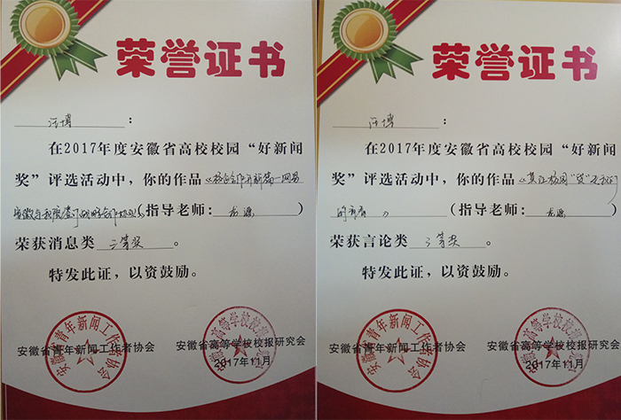 峰会颁奖典礼上,我院大学生记者团再获佳绩。学生记者汪博的《校企合作开新篇——网易安徽与我院签订战略合作协议》(指导老师:龙源)荣获2017年度安徽省高校校园好新闻消息类三等奖、《莫让校园贷“贷”走我们的青春》(指导老师:龙源)荣获2017年度安徽省高校校园好新闻言论类三等奖。