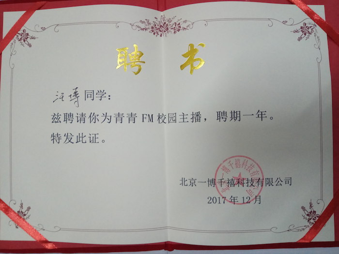17广播电视学专业本学期开设有《中外文学作品选读》课程,在学院2016年新修订的专升本人才培养方案指导下,任课教师鼓励同学们课内课外广泛阅读的同时,注重理论和实践教学相结合,此次比赛达到了以赛促教促学的目的。决赛前,汪博同学在《中外文学作品选读》授课老师李卫国的帮助下,从作品内容、配乐选择、语音语调、情感交流等方面进行了不断改进和优化,并在课堂上进行了多次演练,同学们也提出了宝贵的意见和建议。决赛中,汪博同学克服了在作品情感处理等方面存在的问题,沉着应战,从众多高校优秀选手中脱颖而出,凭借作品《外公的老黄历》夺得原创作品诵读类第一名,并被聘为青春FM校园主播。
