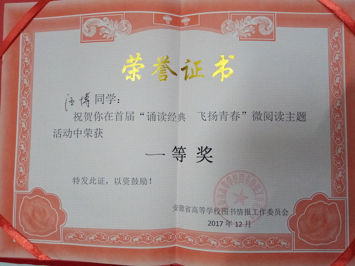 我院新闻播音系17广播电视学1班汪博同学成功晋级决赛,并获得原创作品诵读类一等奖。新闻播音系李卫国老师应组委会邀请,担任此次大赛专业评委。此次比赛原创作品诵读类一等奖共设1名,决赛评委由中国科技大学、合肥工业大学、安徽大学、安徽师范大学、安徽农业大学等五校图书馆负责人,安徽广播电视台主持人、播音主持专业教师和中文专业教师共同组成。