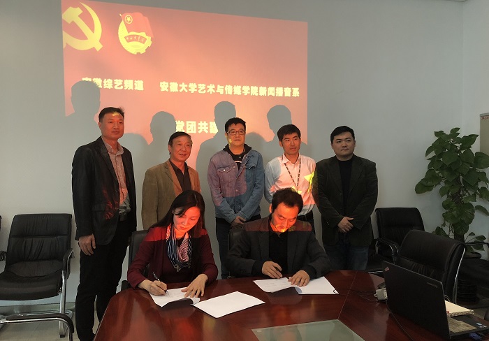 新闻播音系党总支副书记、副主任王琍琍与安徽综艺频道党支部书记、频道总监孙志远共同签署党团共建协议。系党总支组织委员、主任助理张井水,综艺频道党支部组织委员汪纯,宣传委员黄越等共同参加了签约仪式。