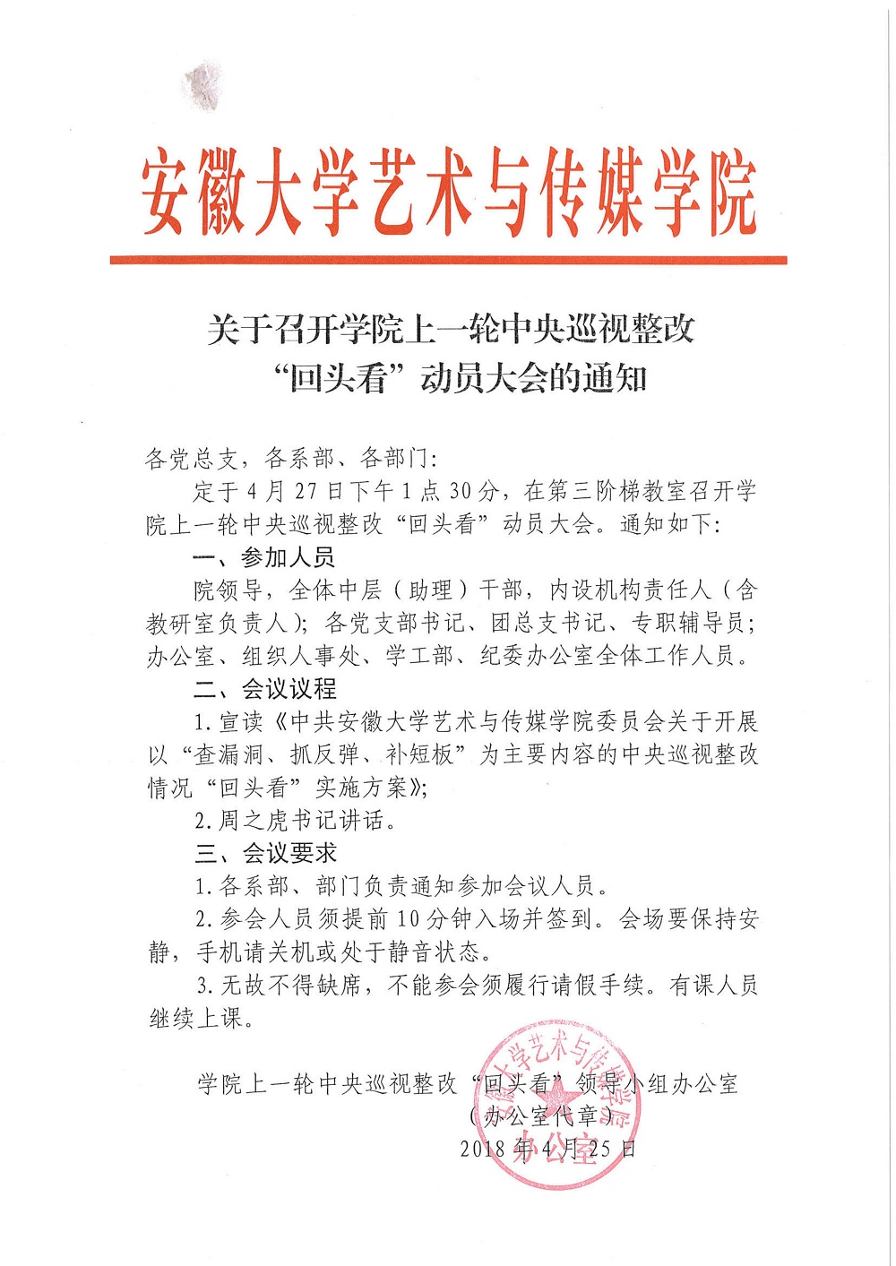 关于召开学院上一轮中央巡视整改“回头看”动员大会的通知