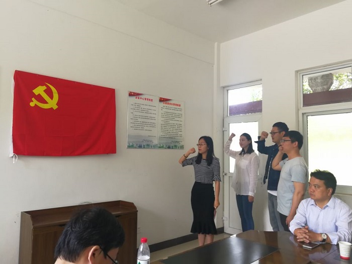 在参观学习结束后,夏傲等3名新党员在党旗下举行了入党宣誓仪式。支部成员院党委书记周之虎教授首先向新入党的通知表示祝贺,同时要求3位同志继续努力,不仅要在组织上入党,更要在思想和行动上入党。