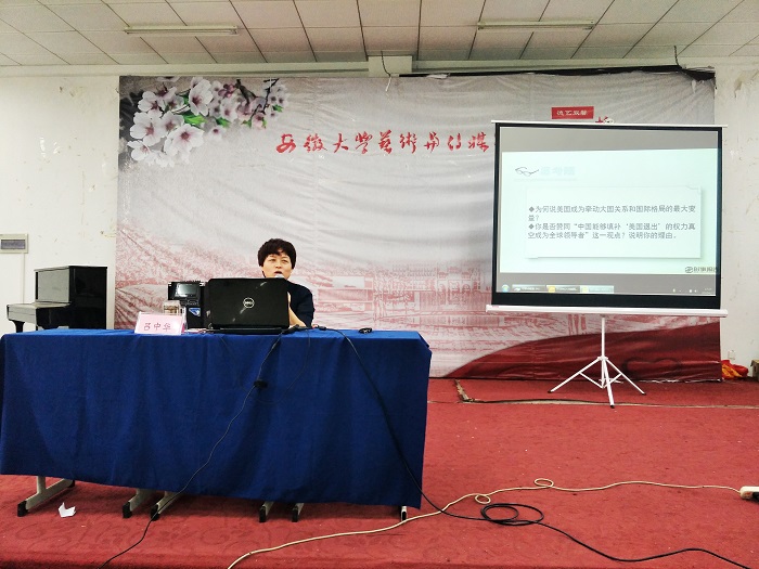 公共教学部主任吕中华教授从中美关系、美国和欧盟之间的关系以及目前中国在国际上的地位等几个方面详细阐述,使同学们充分认识到构建新型国际关系的意义和挑战。讲座中,吕主任与同学们进行一问一答的互动模式,提高了同学们学习的兴趣,同时也深化了他们的认识。