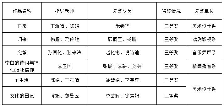 截至8月30日,2018年(第11届)中国大学生计算机设计大赛于铜陵、合肥、南京、福州、上海、杭州六个赛区的比赛已经圆满结束。我院戏剧影视系、音乐舞蹈系、新闻播音系、美术设计系参赛作品6项。经过参赛师生的不懈努力,本次大赛我院再创佳绩,总计斩获二等奖1项,三等奖5项。