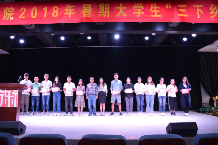 大会伊始,院团委书记陈明宣读了《关于表彰暑期“三下乡”先进个人、“三下乡”活动优秀指导教师、“三下乡”优秀团队、“专业实践活动”优秀个人、“暑期社会实践”优秀组织奖的决定》。随后,出席大会的领导分别为获得“三下乡”先进个人称号的邓杰彬、李小康、秦灿儿等人、获得“三下乡”优秀指导教师称号的新闻播音系青年教师秦帅、获得三下乡”优秀团队称号的小岗村“三下乡”团队、获得“暑期专业社会实践活动”优秀个人称号的朱国珍、何玉佳、王梦雨等人、获得“暑期社会实践”优秀组织奖的新闻播音系团总支和戏剧影视系团总支颁奖。