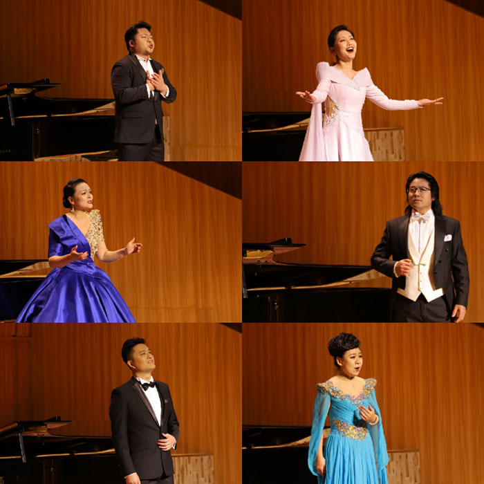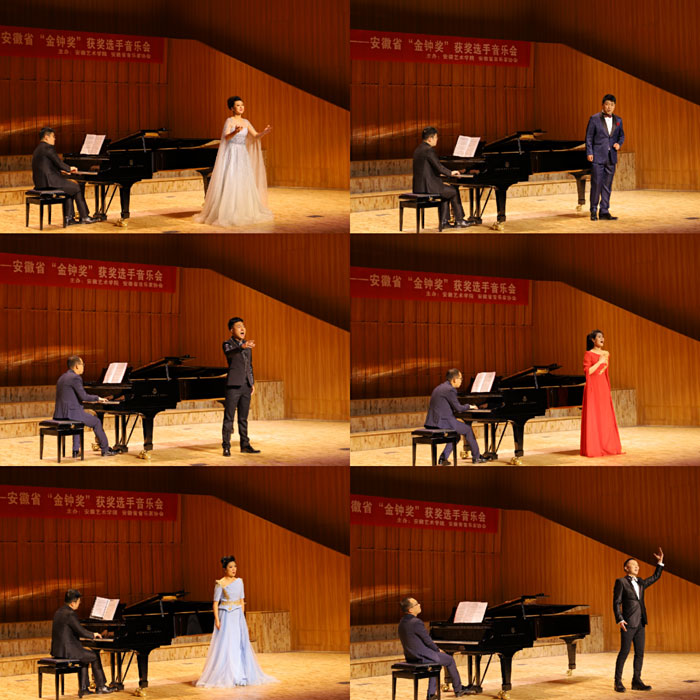 安徽省“金钟奖”获奖选手们娴熟的专业技巧和精湛的演唱水准,为观众们带来了一场听觉盛宴。近两个小时的音乐会共演绎了二十余首中外经典声乐作品,既有表达家国情怀的《祖国万岁》《故乡雨》《没有强大的祖国哪有幸福的家》《沂蒙山的女儿》《帕米尔我的家乡多么美》《我爱这土地》,也有中国诗词歌曲《卜算子·咏梅》《江城子·乙卯正月二十日夜记梦》《沁园春·雪》以及国外经典歌剧选段《青春之声》《安宁安宁》《女人善变》《我去向何方》《我来了,你们大家都让开!》《他也许是我渴望见到的人》等。