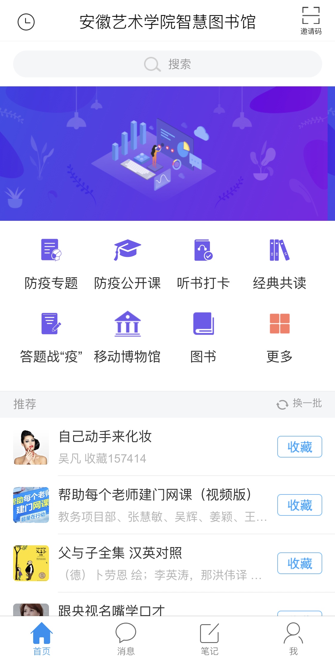 通过搜索“学习通”app或者直接扫描下方二维码进行下载,使用手机号登录注册后,点击首页右上角邀请码并输入“ahysxy”,即可进入新葡的京集团3512vip智慧图书馆。