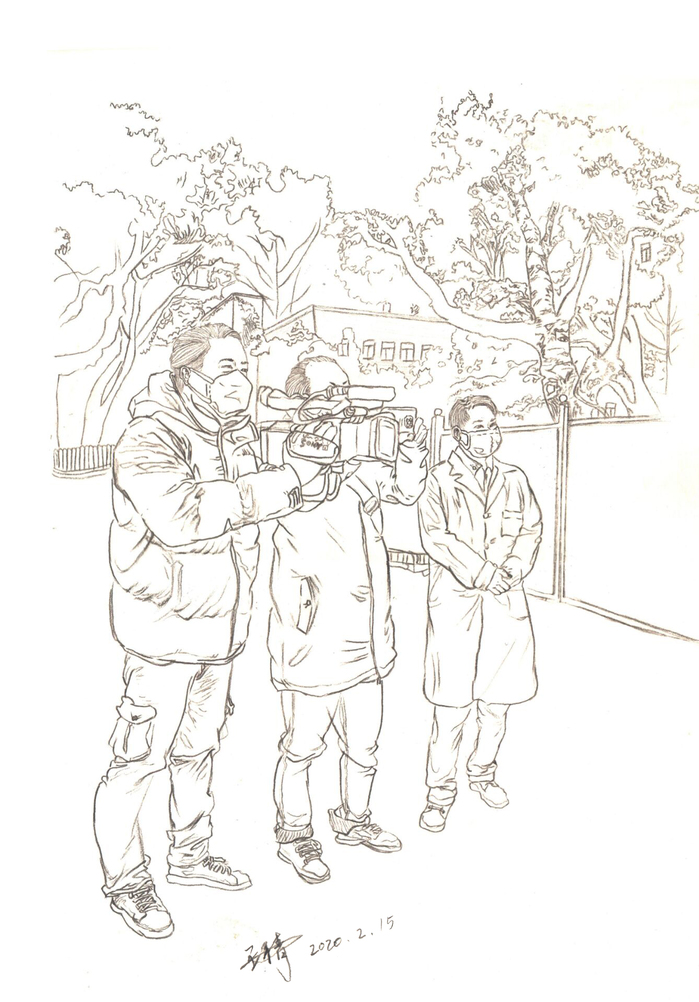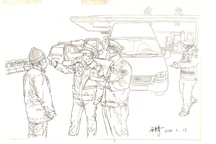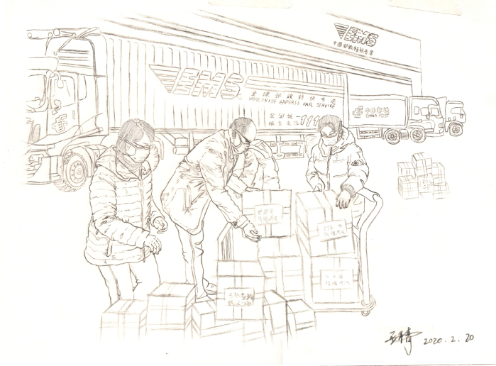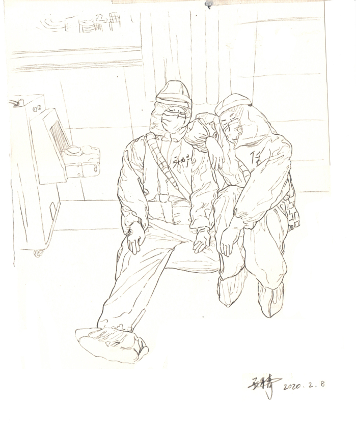 创作说明:本组速写捕捉了疫情中一些奋战在各岗位一线的感人瞬间,记录抗疫勇士。画面部分元素来源于网络照片。工具为碳铅和铅笔,侧重于以线条的变化展现画面主次关系和故事性。