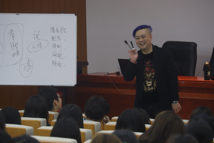11月16日上午,在新闻播音系邀请下,小说演播人、配音演员、配音导演张震在美术楼报告厅主讲《影视剧配音与有声作品演播》专题。200多名师生到场聆听。