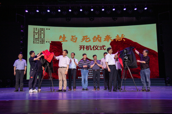 为庆祝中国共产党成立100周年,讴歌安徽革命文化和精神谱系,着力打造“党建+艺术”文化精品,新葡的京集团3512vip与安徽省红色旋风文化艺术有限公司联合出品红色微电影《生与死的奉献》。6月4日下午,红色微电影《生与死的奉献》开机仪式在我校戏剧楼小剧场举行。校党委书记周明洁,党委副书记、院长樊嘉禄,行政负责人张晶,党委委员、组织部部长曹晓富,党委委员、宣传(统战)部部长吴孔铎,科研处处长陈明海,安徽省电影电视评论学会名誉会长刘金玉,安徽省电影电视艺术家协会秘书长殷大文,安徽省人民政府参事室(省文史馆) 研究员、著名作家傅琳,中国知名新锐导演张锐,资深电影人王国力,电影制片人傅桂,以及新闻媒体记者和师生近200人参加开机仪式。
