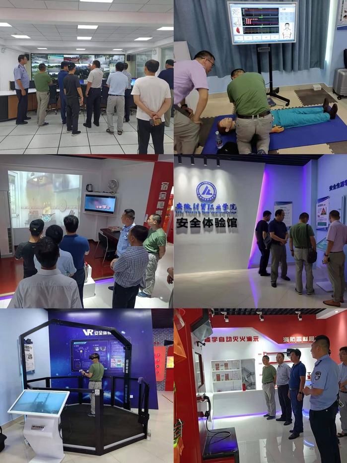 在安徽财贸职业学院,保卫处一行重点考察了该校占地130平米、可同时容纳50人体验的安全体验馆。安全体验馆共设计了综合安全、交通安全、急救知识、消防安全四大模块,每个模块都有一系列的安全体验设备。包括安全文化展板、VR安全体验区、安全生活学习区、安全知识竞赛区、模拟安全驾驶机、心肺复苏模拟人、海姆立克急救训练、灭火实训教学系统、烟雾逃生体验屋、结绳、消防标识墙等11项安全体验项目。