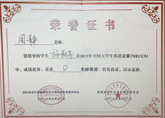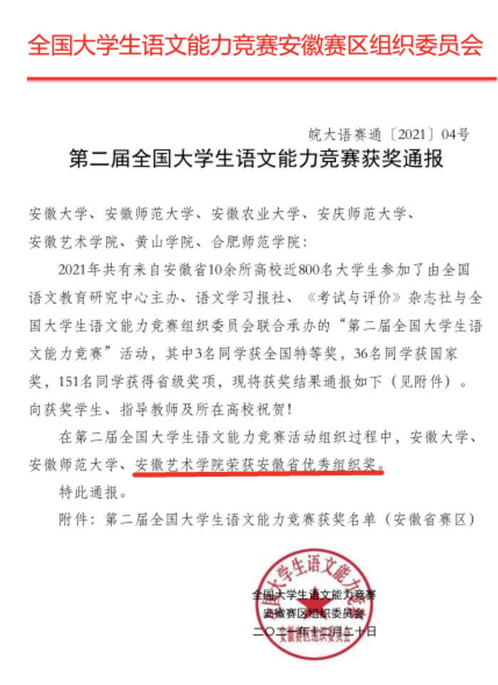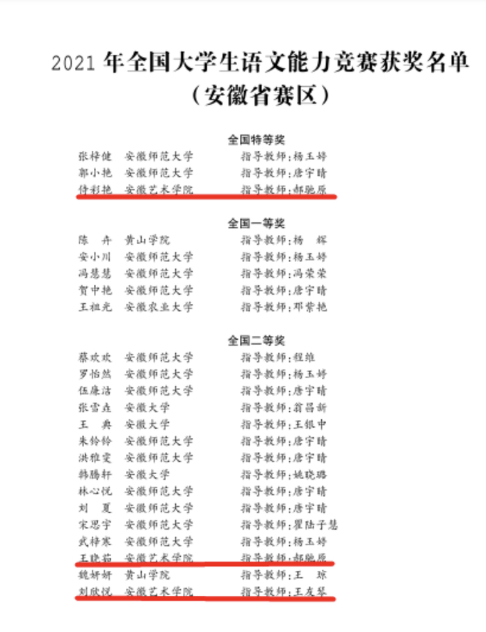 2021年,在第二届全国大学生语文能力竞赛中,公共教学部提前谋划,严格遴选指导教师,精心组织学生备考参赛。经过省赛、国赛两轮角逐,我校获“优秀组织奖”。1名学生获得全国大学生语文能力竞赛国家级特等奖,2名学生分获国家级二等奖、三等奖,17名学生获得省级一二三等奖。