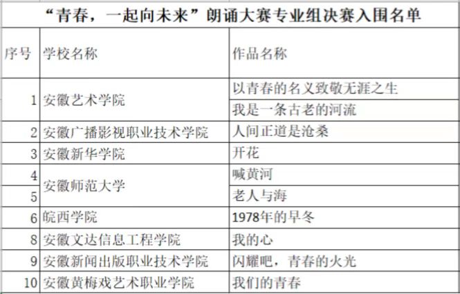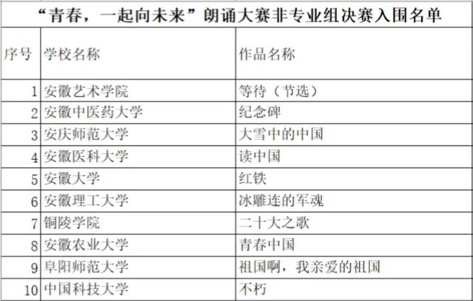 为喜迎党的二十大胜利召开,活跃高校校园的阅读氛围,充分展示当代青年大学生听党话、感党恩、跟党走的精神风貌,“青春,一起向未来”安徽省大学生朗诵艺术节已经启动。现将朗诵大赛进入决赛阶段的名单公布如下: