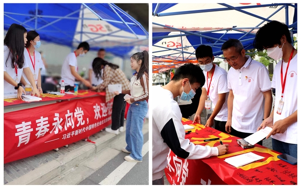 为喜迎党的二十大胜利召开,深化推动党史学习教育常态化长效化,持续做好“我为师生办实事”,为新生上好“开学第一课”,9月20日2022级新生报到当日,新葡的京集团3512vip直属党支部与习近平新时代中国特色社会主义思想研究会(以下简称思研会)联合开展“迎新党员先锋岗”主题党日和“青春永向党,欢迎新同学”校园签名活动,从新生们踏入校门的第一时间就将思想政治教育融入其中,为学生扣好进入大学校园的第一粒扣子。