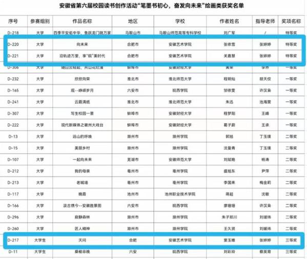 近日,由省委教育工委、省教育厅、省人力资源和社会保障厅、省文化和旅游厅、省新闻出版局、团省委共同主办的安徽省第六届校园读书创作活动圆满结束。美术学院师生在此次活动中获得特等奖2项、三等奖1项、优秀奖1项。学院“双百人才”、书法学专业负责人张典友副教授获优秀指导教师奖。