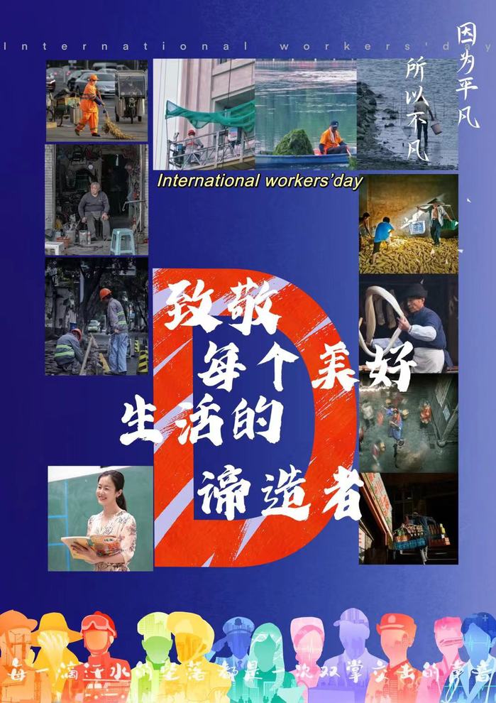 海报介绍:用每个不同劳动者的照片拼出来的五一,更能突出劳动这个主题,中间组成五的那个D,没有全涂成红色,寓意不完美所以平凡,与右上角的因为平凡,所以不凡相呼应,我认为劳动者是每一个美好生活的缔造者,我把这句话放在了海报的最中间,突出劳动的主体。背景是纹理渐变蓝,蓝色包容万物。画面的最底端是我拼贴的每个各个职业的素材,每个素材里边,都有关于他们的职业影像,简洁明了。