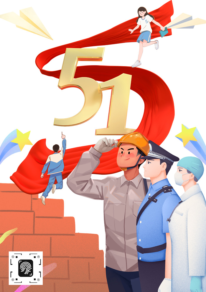《奔赴》作品说明:主要以五一劳动节为主题,社会上的几个劳动代表职位特征为创作元素,配合学生形象进行创作,鼓励学生积极参与社会劳动,以劳动为荣,积极就业!