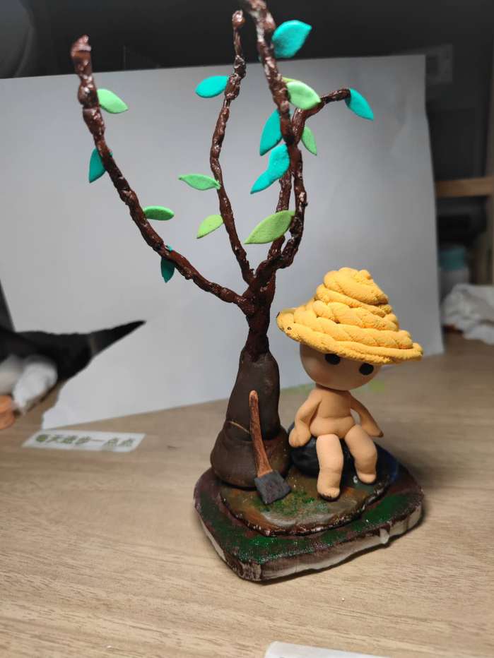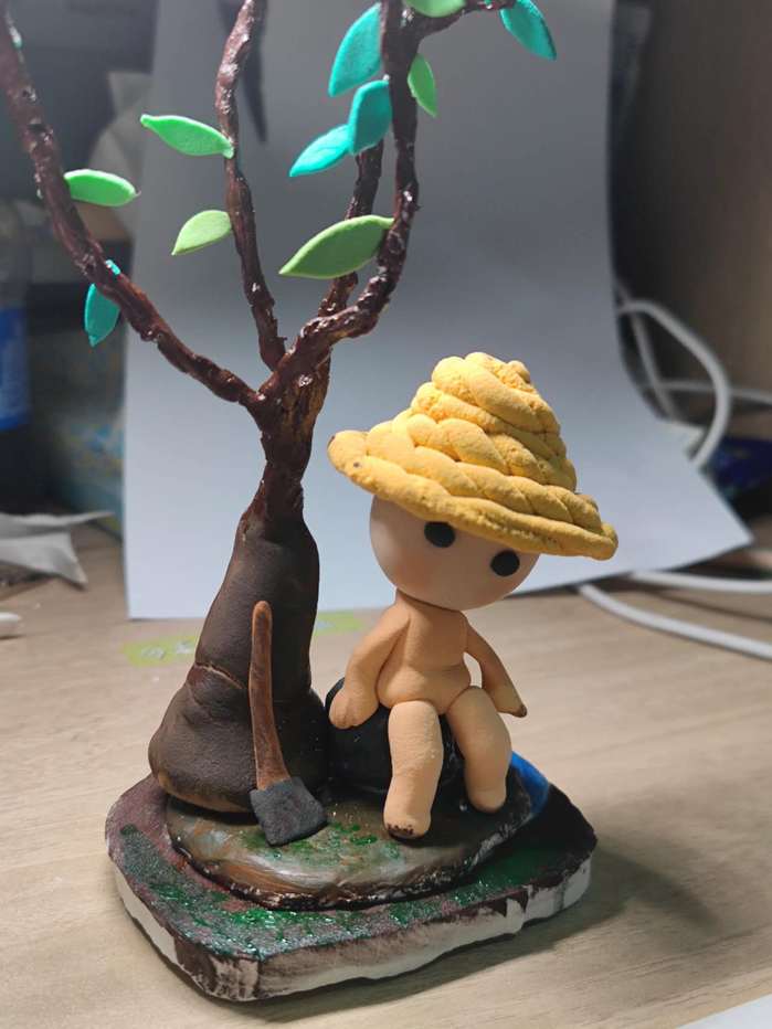 本作品利用粘土的表现形式展现劳动过后的劳动者于树荫下随意闲坐休憩的场景。劳动者在疲劳的工作过后,手脚和劳动工具上的泥土还没来得及清洗,展现了普通劳动者辛勤劳作、积极奋斗的精神以及对于生活的热爱。