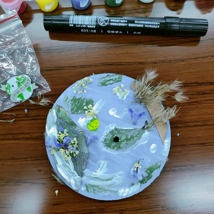 收集校园枯枝落叶和野花,颜料,对圆形纸片进行装饰,拼成地球的形状,提高动手能力,发挥想象力。