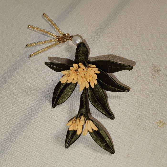 本次劳动作品展示活动,我选择尝试中国传统非遗手工制作“缠花”。所谓“缠花”,就是用各种颜色的丝线在用铜丝和纸片构成的坯架上缠绕出各种精美的部件,再经过各种组合变成手工品,多用于发簪的制作。我所制作的是桂花胸针,工程难度较小。
