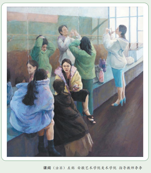《课间》以校园生活为创作素材,以我校舞蹈学院课间休息的女学生为创作对象,通过校园学习生活的一个缩影,展现学生青春时代的自信与美好,体现和谐美好的校园氛围和向上的文化气息。
