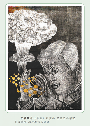 《忆昔抚今》以两弹元勋邓稼先为创作素材,作品图案由三部分组成。为了更加突出人物,增强视觉效果,蘑菇云的刻画形式在画面中采用灰面表现,符号采用贴金箔的形式。整个画面黑白灰节奏分明,让人感受到和谐而有力的表现效果。