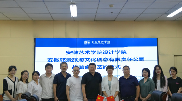 7月17日下午,设计学院与安徽乾景文化旅游创意有限责任公司在设计楼403室签署战略合作协议。安徽乾景文化旅游创意有限责任公司董事长赵媚、总经理方正,设计学院党总支书记陈明,副书记、副院长夏守军,副院长撒后余等参加签约仪式。
