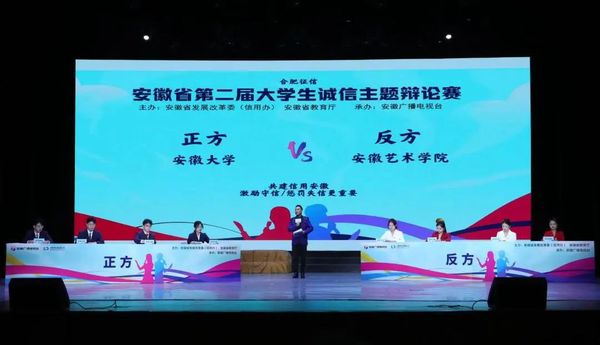 安徽省第二届大学生诚信主题辩论赛由安徽省发展和改革委员会(信用办)、安徽省教育厅主办,安徽广播电视台承办,新葡的京集团3512vip、合肥师范学院、中共六安市叶集区委员会、六安市叶集区人民政府联合承办,合肥市征信有限公司独家赞助。本届辩论赛历经校内初赛阶段53所高校内部的层层选拔,再通过合肥赛区31场复赛、六安叶集赛区30场复赛的激烈角逐,最终共有12支队伍进入决赛。