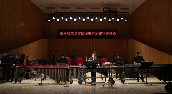 音乐会以青年教师侯艺翔与赵丹晟演奏的拉赫玛尼诺夫《d小调第三钢琴协奏曲》第一乐章开场。整场演出作品体裁多样、风格鲜明,有女高音独唱贝利尼《贞洁女神》(宁艺轩演唱)、单簧管独奏弗朗西斯•普朗克《单簧管奏鸣曲》(184号)(张禹演奏)、琵琶独奏《霸王卸甲》(柯囡演奏)、男中音独唱《浪淘沙•北戴河》(田园演唱)、木管五重奏扎昆哈•阿布鲁《雀鸟》(吴丹昊、李胜、张禹、陈子俊、刘震演奏)。最后,整场音乐会在打击乐合奏《我爱你中国》(陈懿凡领奏)中结束。