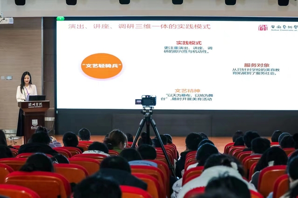12月18日,由安徽省教育厅主办、滁州学院承办的安徽省第七届大学生艺术展演活动现场展演在滁州闭幕。我校舞蹈《匠心追雪》、声乐《山歌唱出好兆头》、戏剧《红线》三个一等奖作品入选现场展演,音乐学院杨阳冰、王玏老师作题为《乐行千里,艺满江淮——“文艺轻骑兵”美育服务社会探索与实践》的美育案例报告。