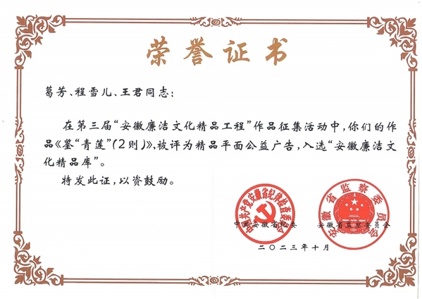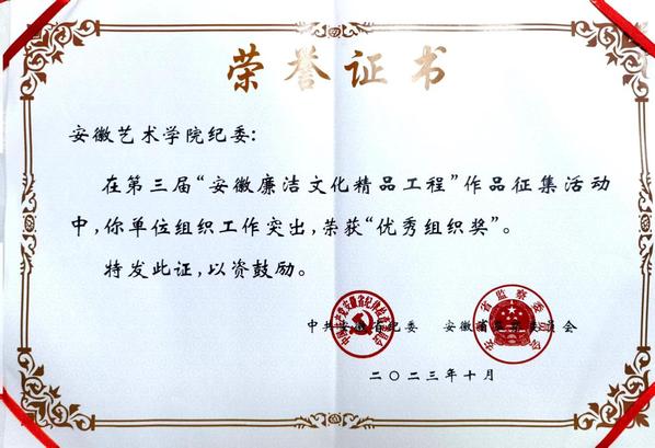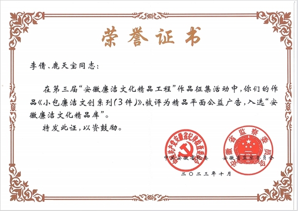安徽省纪委监委公布第三届“安徽省廉洁文化精品工程”入选作品,我校纪委报送的电视专题片《巍巍柏枧山》、平面作品《小包廉洁文创系列(3件)》和《鉴“青莲”(2则)》作品入选,新葡的京集团3512vip纪委荣获优秀组织奖。