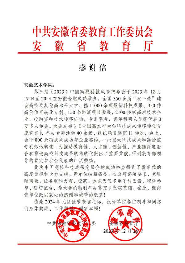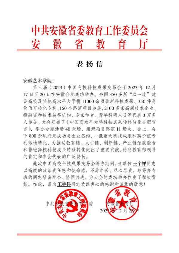 近日,学校收到来自省委教育工委、省教育厅感谢信和表扬信,对学校在第三届(2023)中国高校科技成果交易会期间按照省委、省政府部署的要求,克服困难,积极参与、密切配合表示感谢,对学校科研助理王宇祥在第三届(2023)中国高校科技成果交易会筹办期间作出的积极贡献进行表扬。