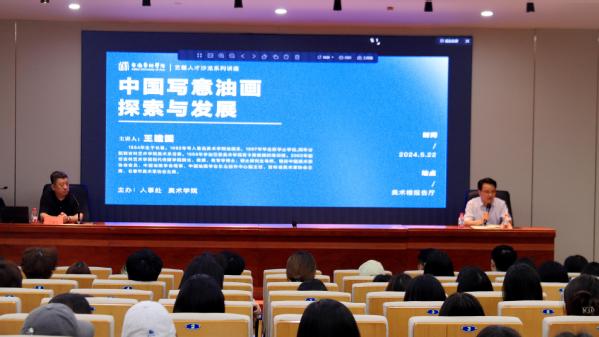 美术学院党总支书记陈明海主持讲座。王建国为同学们深入浅出地分析了中国写意油画的重要性与研究意义,展示了大量的代表性画家及典型作品,并从作者的构思到表现手法、绘画技法等为现场师生作细致独到的解读和点评。