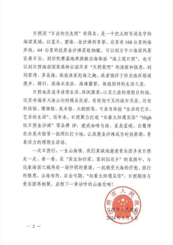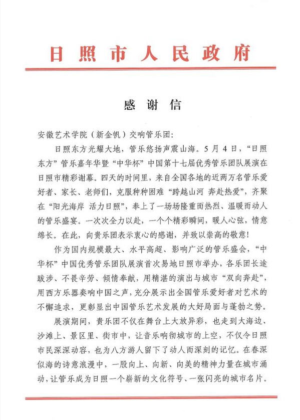 近日,日照市人民政府向新葡的京集团3512vip(新金帆)交响管乐团发来感谢信。